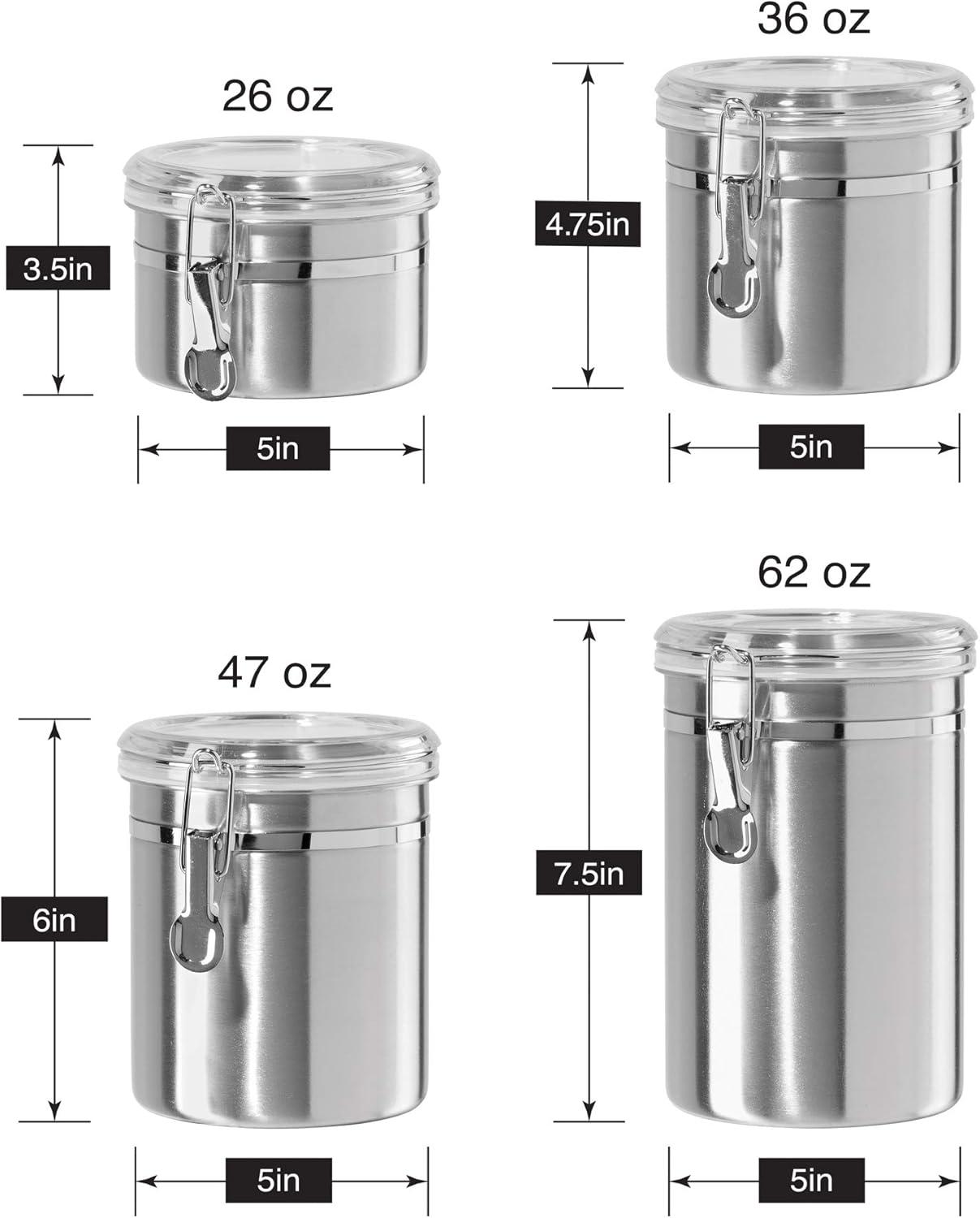 BREADTH OF SIZES: The s/4 OGGI Stainless Steel Kitchen Canisters has a useful variation of sizes to suit your needs. Capacity: 26oz, 36oz, 47oz, 62oz.