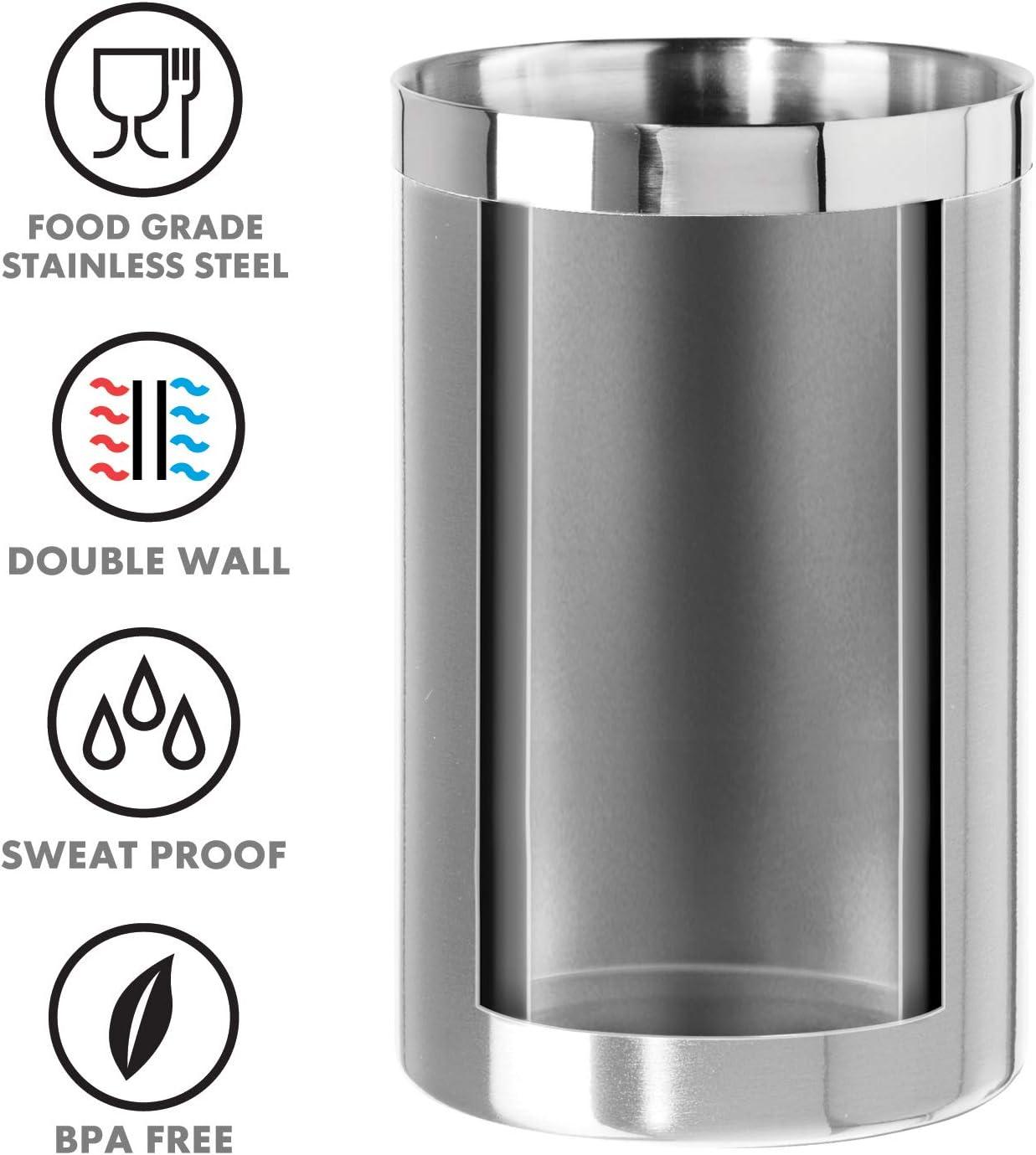 OGGI's Stainless Steel Wine Cooler will maintain the chill you wish when sipping your favorite cold, crisp wine. Crafted of high quality stainless steel with double wall insulation which creates a thermal core to keep contents colder longer. The brushed stainless steel body works well with any home decor. This double wall wine cooler from Oggi features an elegant stainless steel body with a beautiful satin finish sure to catch the eye. The wine cooler holds a single standard size bottle. Just chill your favorite wine in the refrigerator, then take it out and place it in the wine cooler to enjoy it at your table.