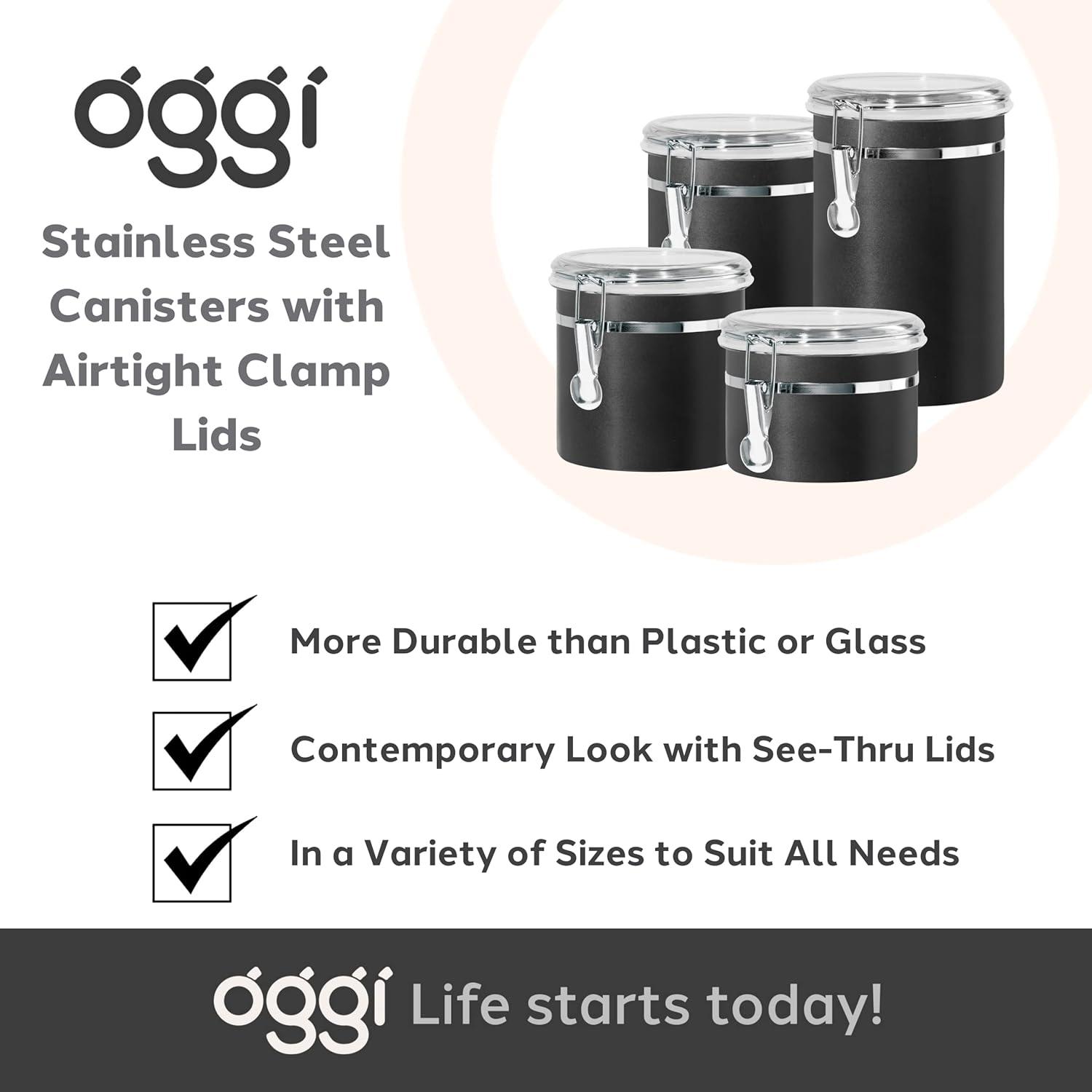 PREMIUM MATERIALS: OGGI Stainless Steel Kitchen Canisters are crafted from food grade stainless steel and the clear lids are BPA free with a long-lasting silicone seal to protect your food.