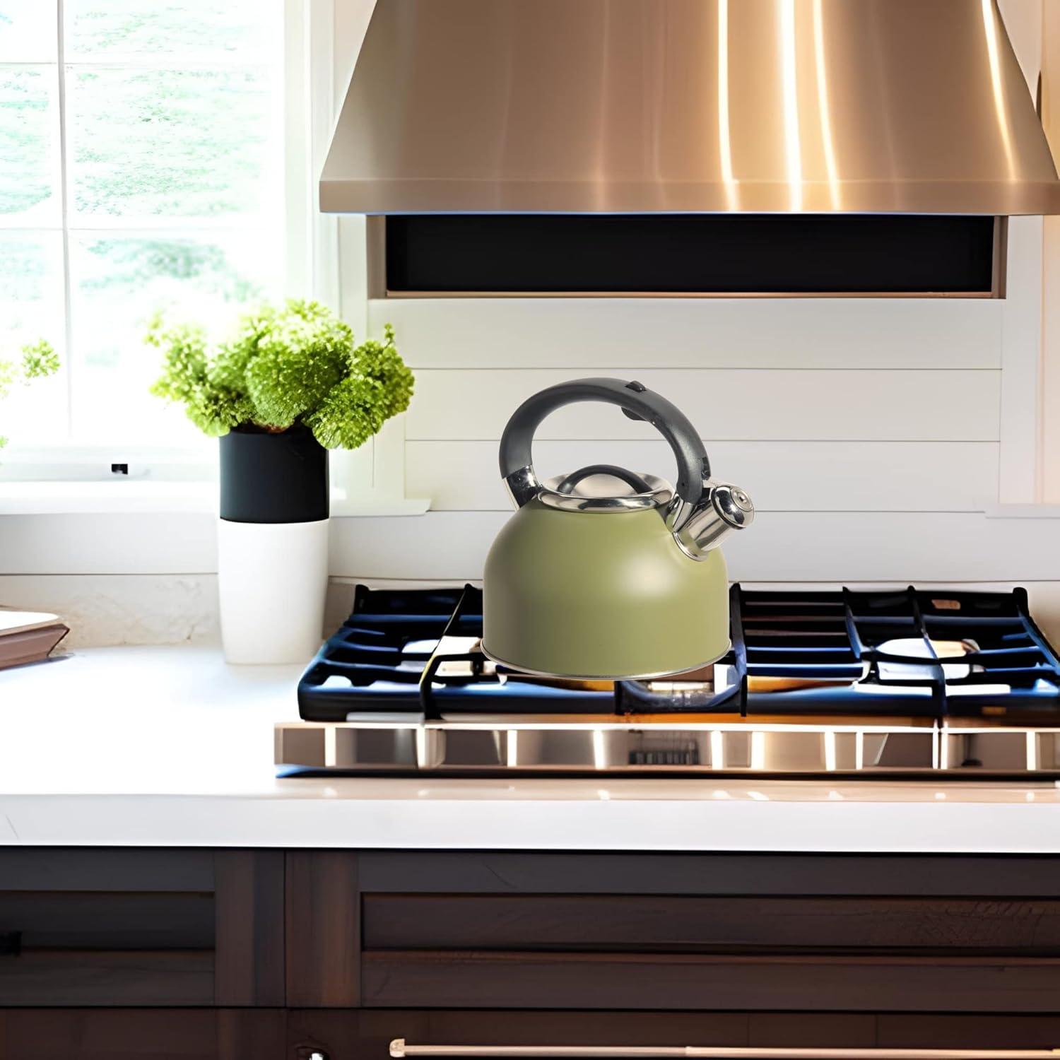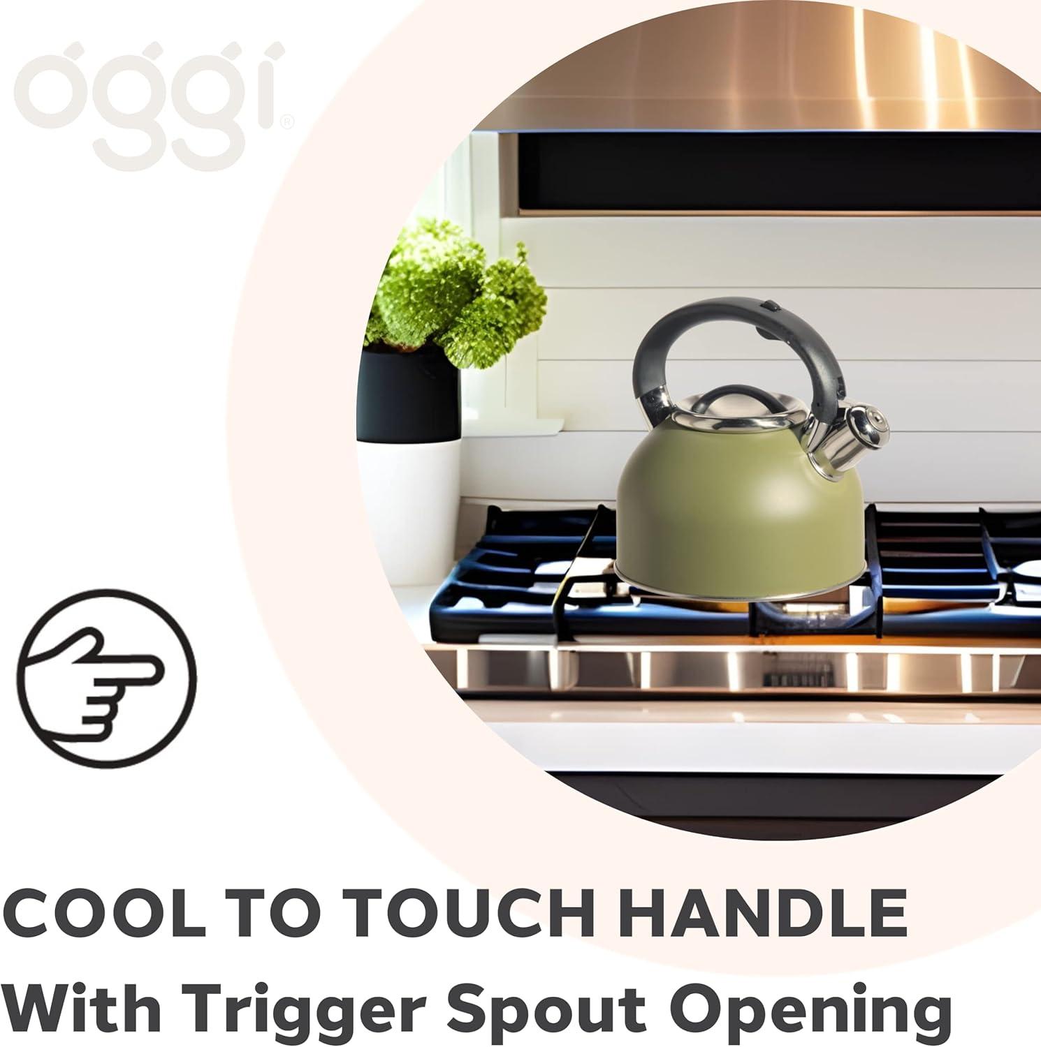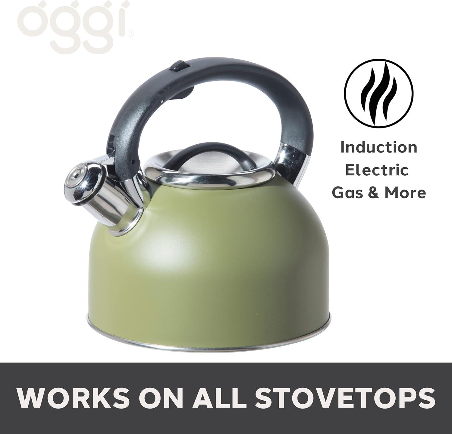 OGGI Tea Kettle for Stove Top - 64oz / 1.9lt, Stainless Steel with Loud Whistle, Ideal Hot Water Kettle and Water Boiler - Silver Mirror(Olive)