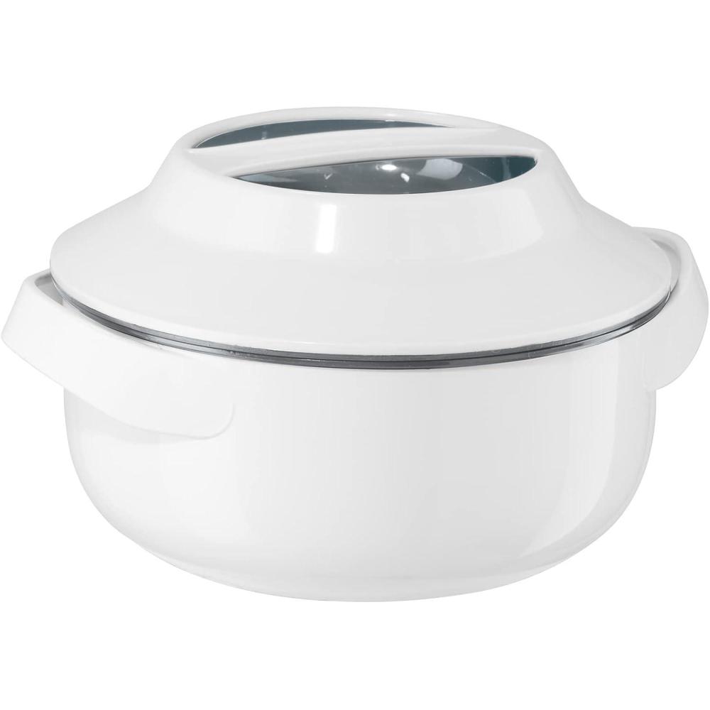 No more serving room temperature food! OGGI’s Insulated Microwaveable Serving Bowl allows dishes to always be served at the right temperature. It will quickly become your go-to way to serve leftovers in, you can heat and then serve your food straight from this bowl! The inner stainless steel bowl can be put in the microwave to warm dishes up, while its insulating plastic exterior delivers thermal properties that keep hot foods hot and cold foods chilled for hours. The insulated locking lid works to maintain the desired temperature and its carry handle makes it easy to transport and pass across the table. These are perfect for holidays or celebrations with family and friends. Add one or all three available serving bowls to your kitchen tools collection. OGGI's microwavable serving bowls are available in 0.8, 1.5, and 2.3-quarts. To maintain the highest quality possible, hand washing is recommended.