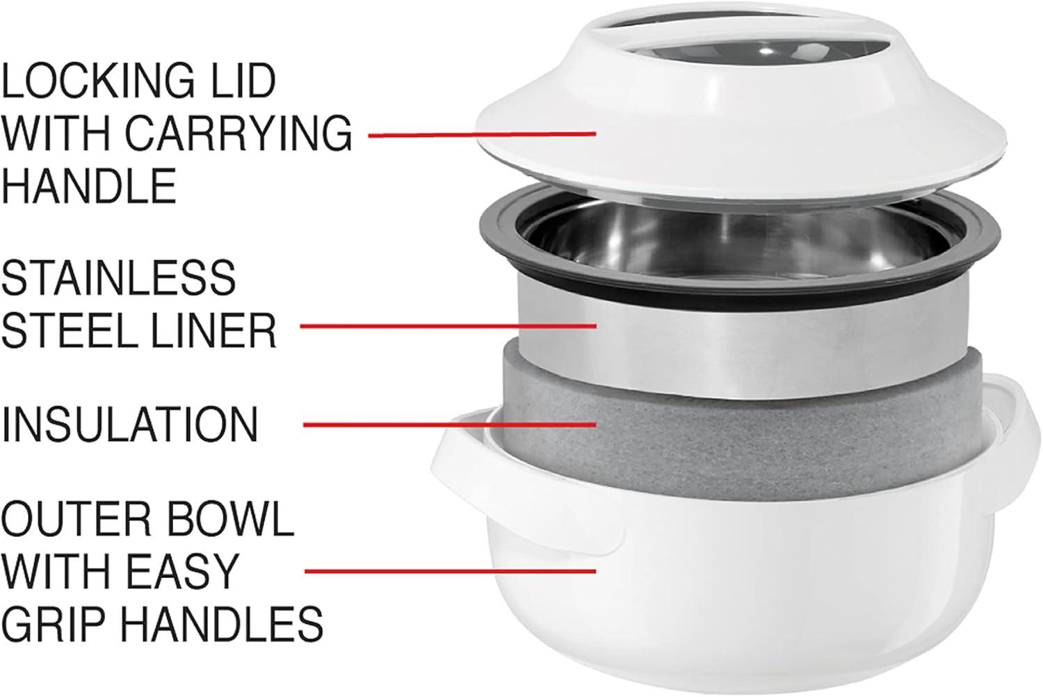 Oggi White 1.5qt Microwaveable Insulated Serving Bowl – Double Wall Food Container with Stainless Steel Liner, Great for Picnics & Parties(2.3 Quart)